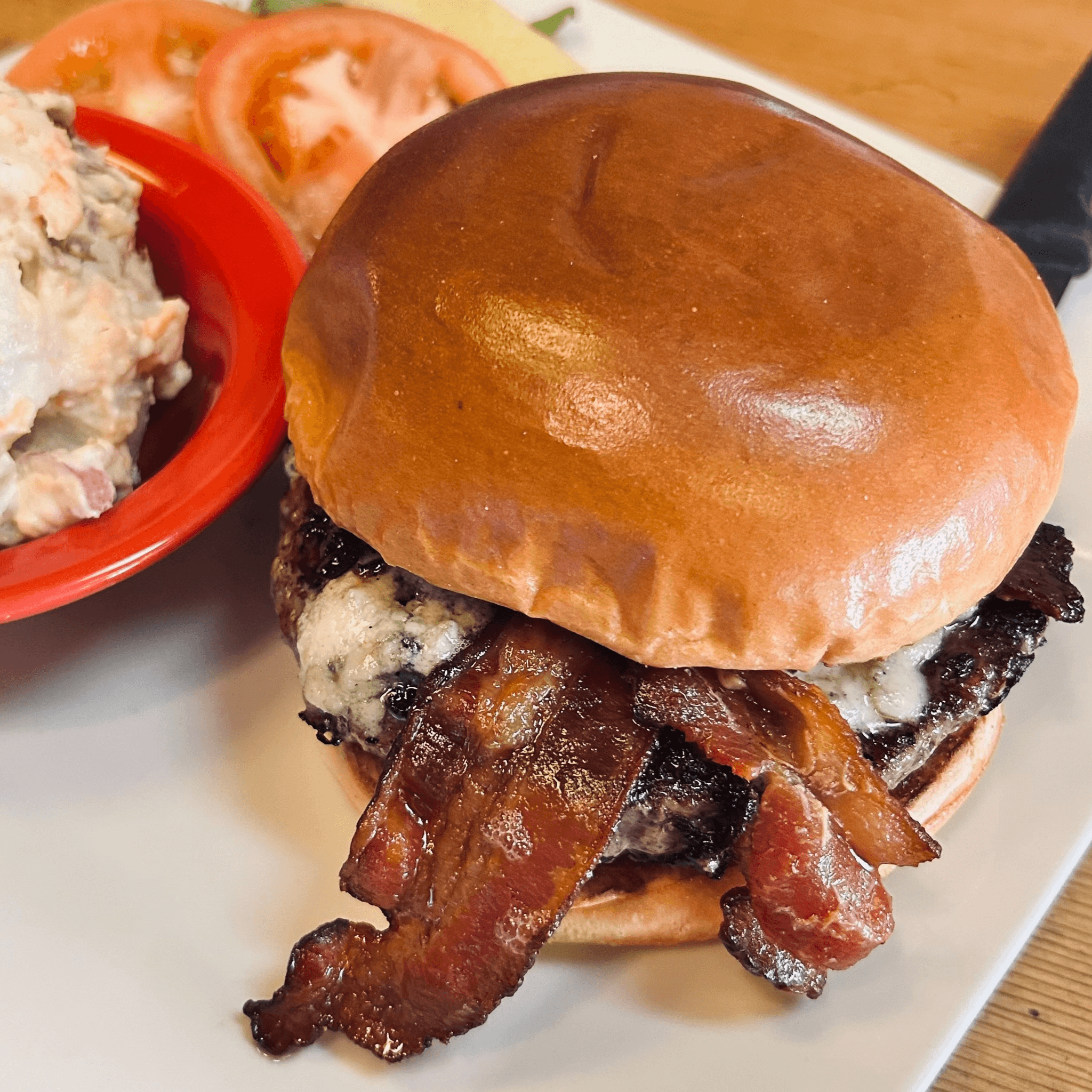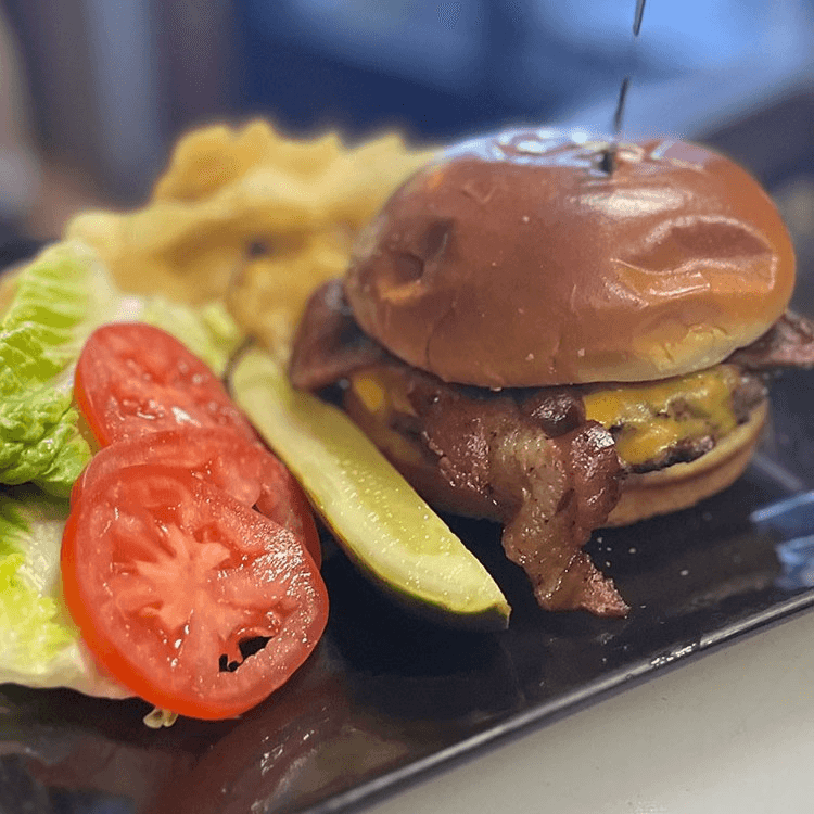 With thick cut bacon and sliced cheddar. Served with lettuce and tomato on the side. Served with kettle chips & a pickle or substitute one of these sides: potato salad, butter beans, small salad; or sub fruit bowl or soup for additional charge
