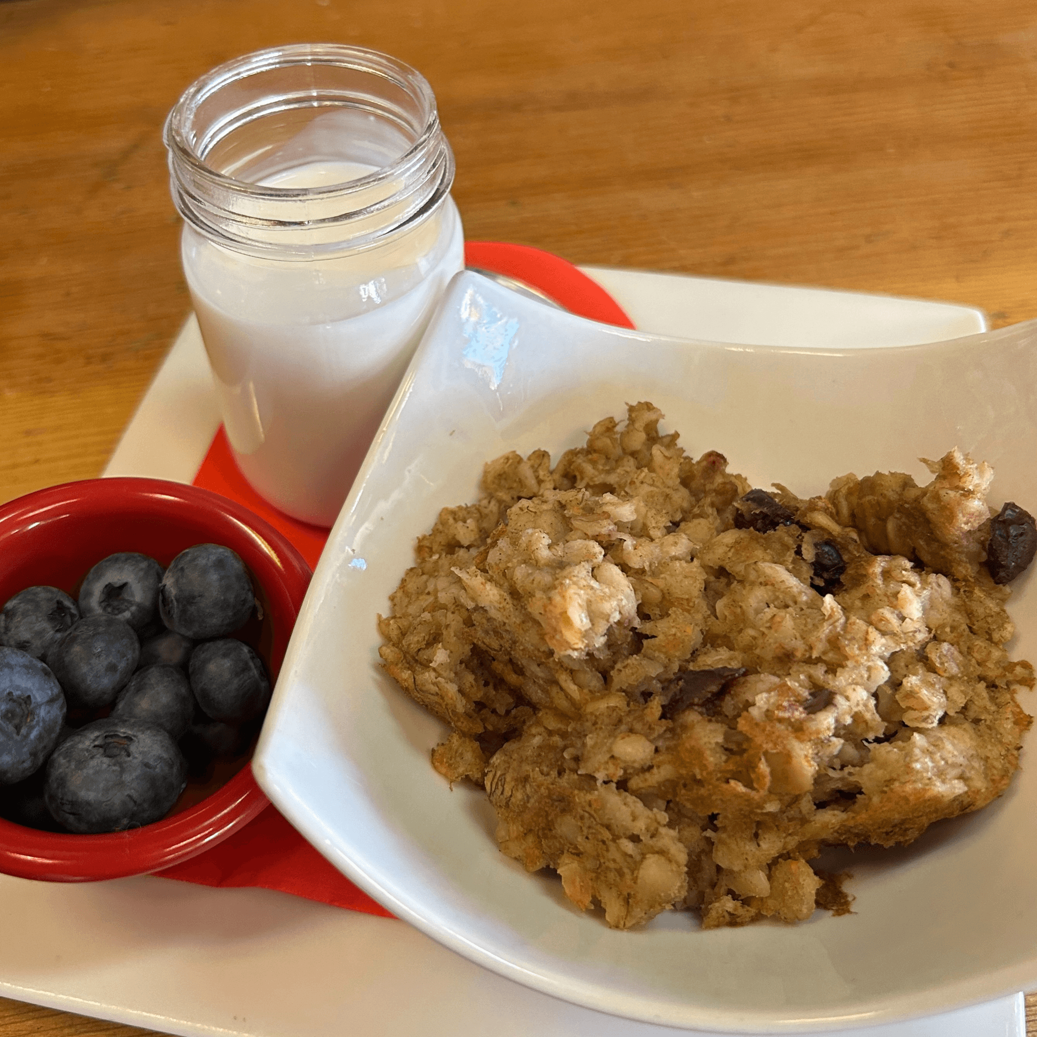 Oatmeal baked with cranberries, bananas, cinnamon and vanilla, served warm with fresh blueberries and cream on the side