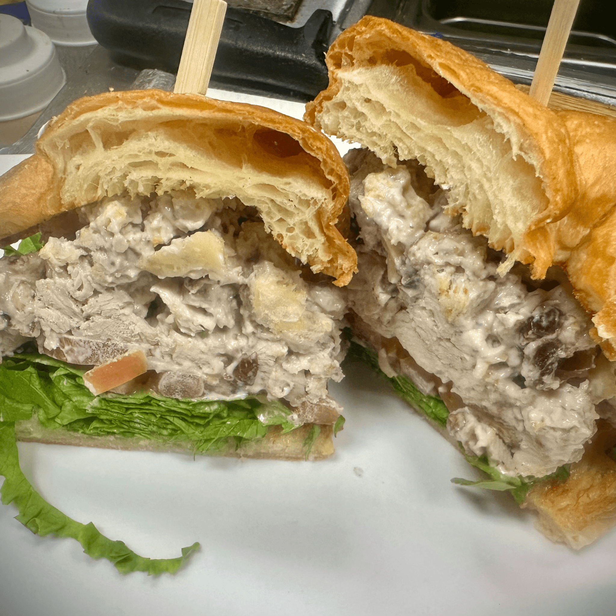 Chicken breast, walnuts and cranberries blended with mayo and served on a croissant with lettuce and tomato. Served with kettle chips & a pickle or substitute one of these sides: potato salad, butter beans, small salad; or sub fruit bowl or soup for additional charge