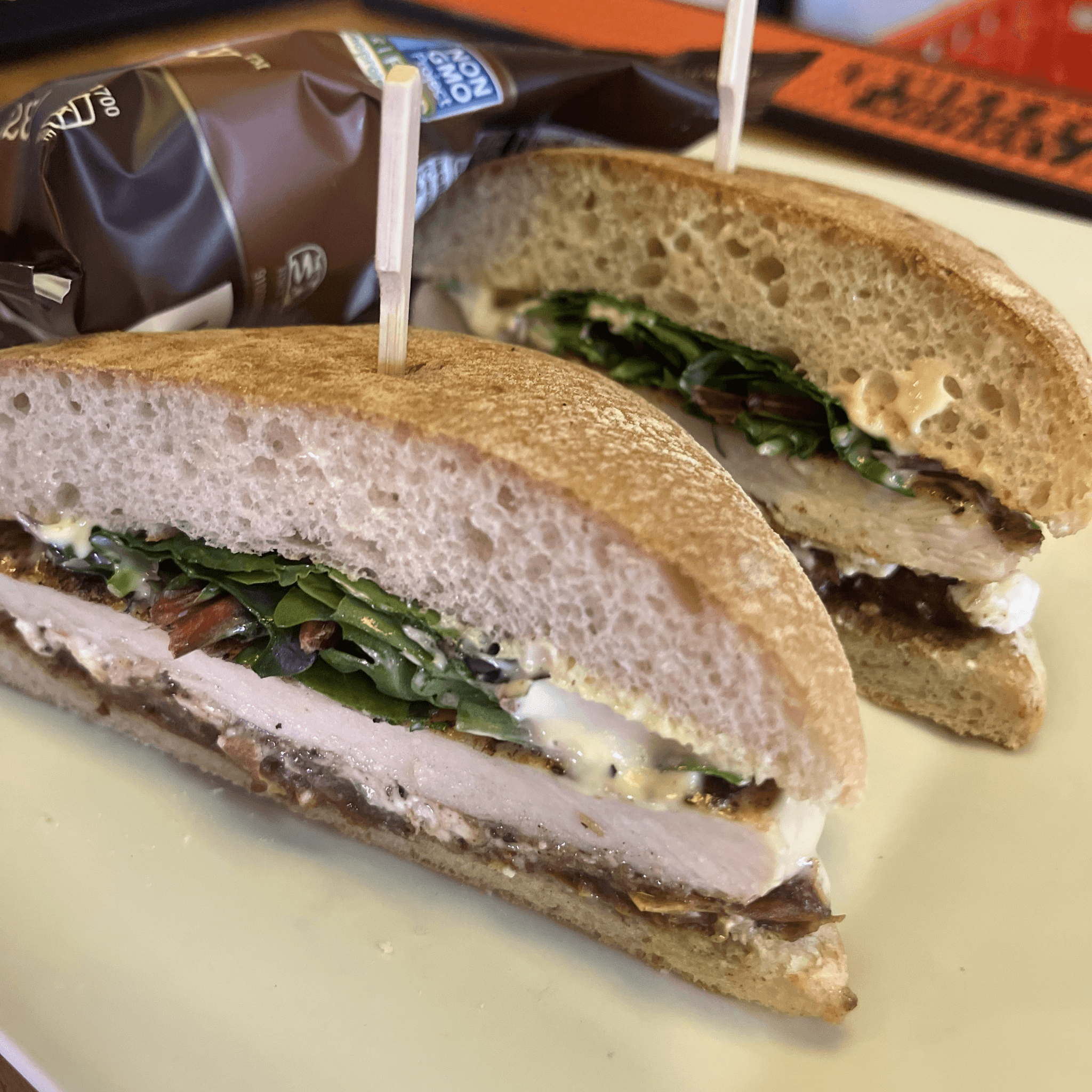 Grilled chicken, tomato confit, mustard aioli, goat cheese & lettuce on a toasted ciabatta roll. Served with kettle chips & a pickle or substitute one of these sides: potato salad, butter beans, small salad; or sub fruit bowl or soup for additional charge