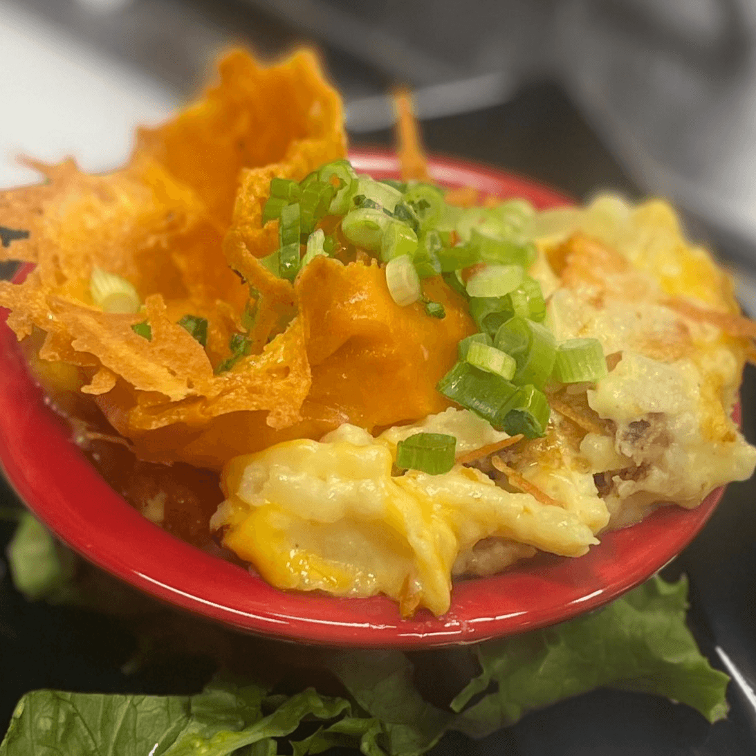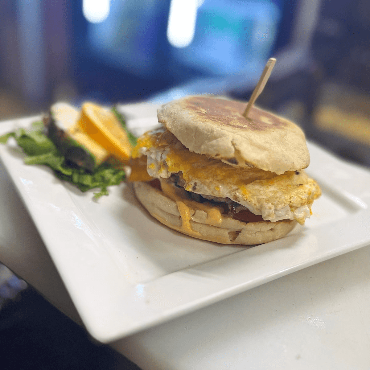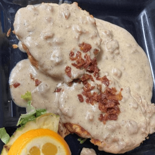 House-made sausage gravy poured over fresh baked buttermilk biscuit, topped with crumbled bacon