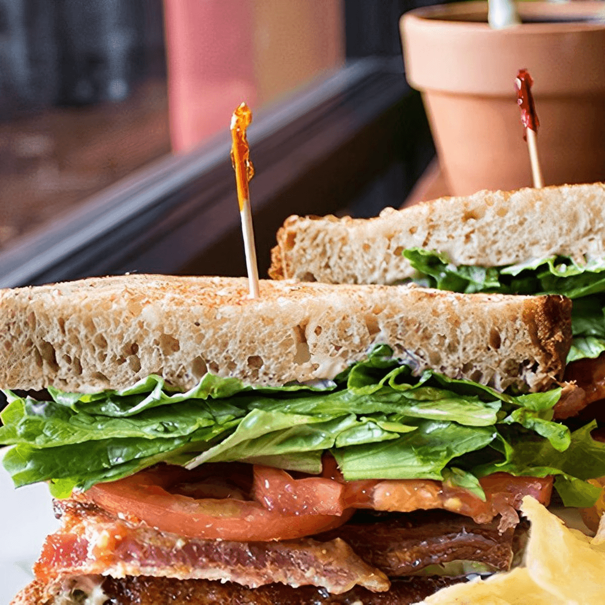 Thick sliced bacon with lettuce, tomato, and avocado, served on toasted whole wheat with mayo. Served with kettle chips & a pickle or substitute one of these sides: potato salad, butter beans, small salad; or sub fruit bowl or soup for additional charge