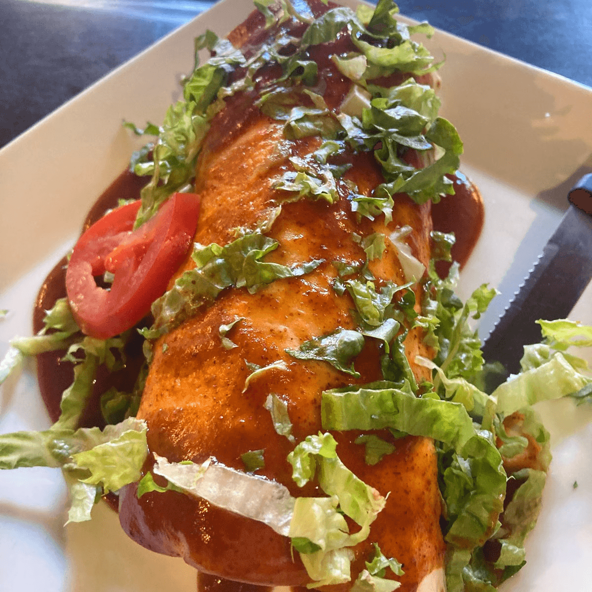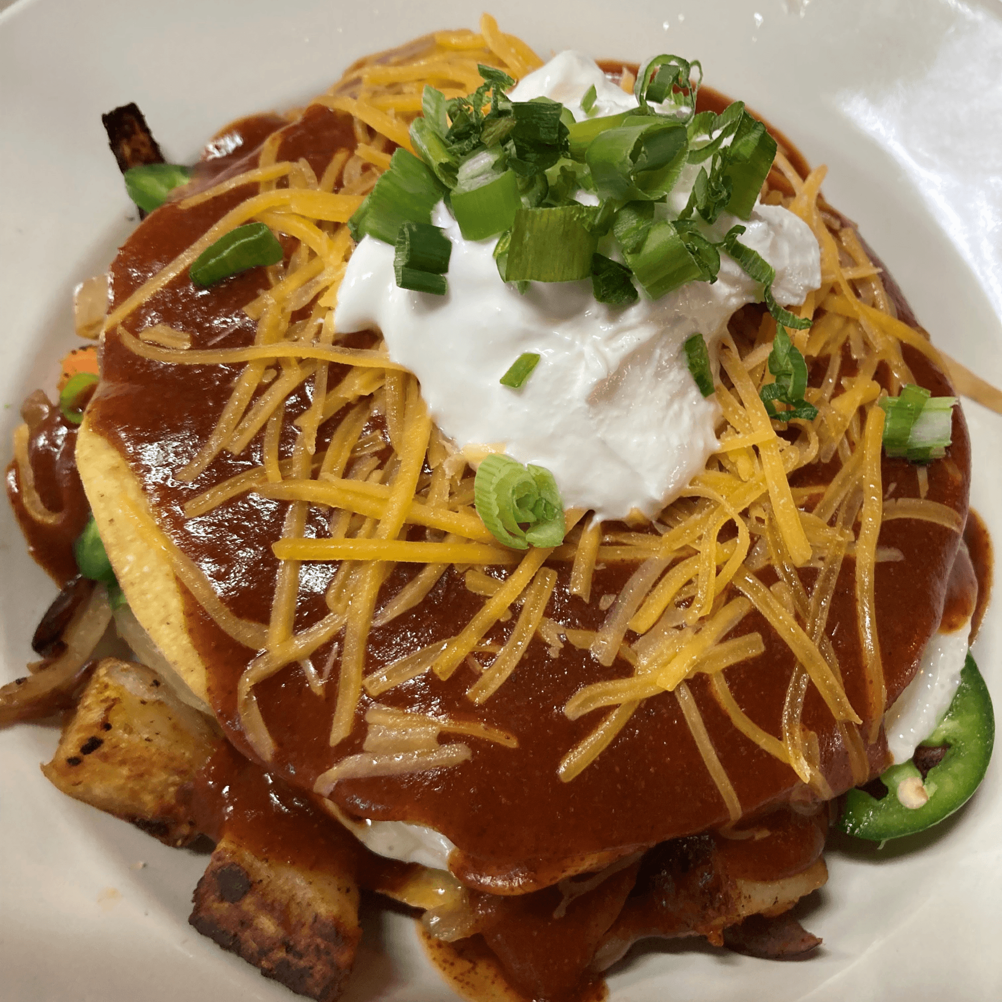 Sweet potatoes, avocado, black beans, green chilies, topped with enchilada sauce, shredded lettuce, & pico. Fresh salsa on the side