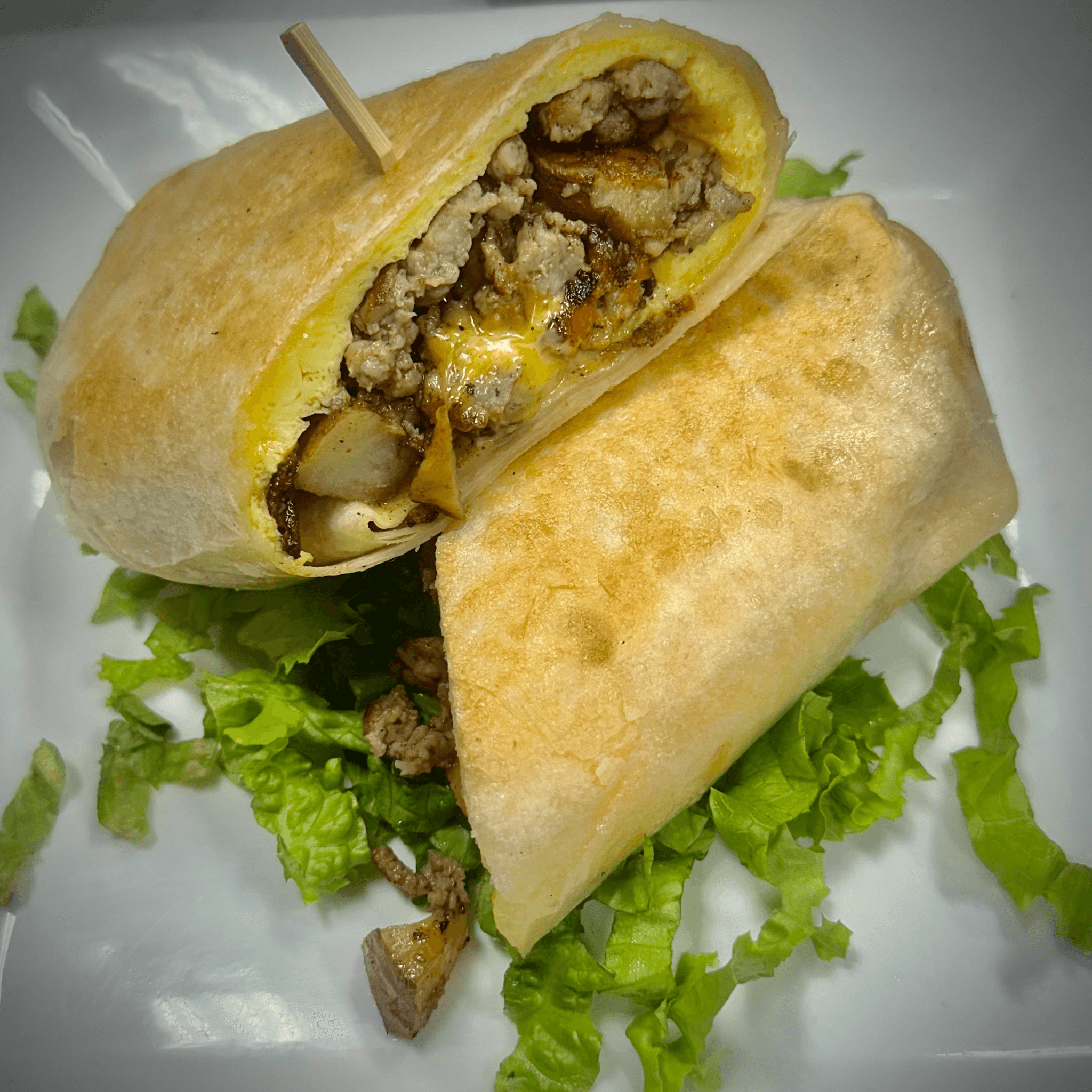 Your choice of bacon, sausage, or avocado. 2 eggs scrambled with Cheddar cheese, home fries and sriracha aioli in a flour tortilla, on a bed of shredded lettuce with salsa on the side