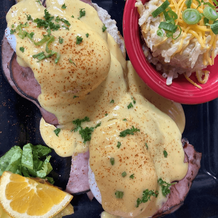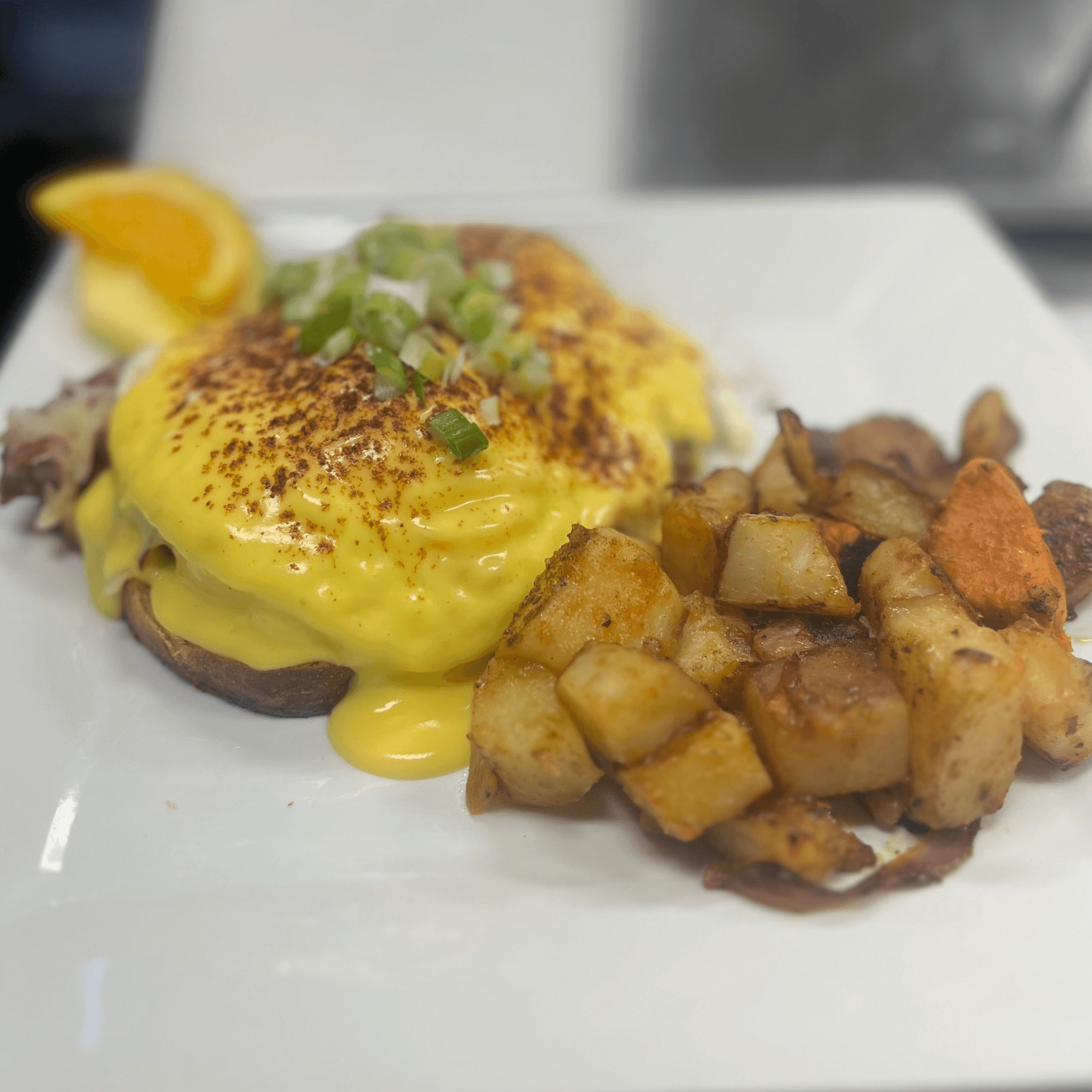 Toasted English muffin topped with, sliced ham, poached eggs and topped with hollandaise, served with home fries