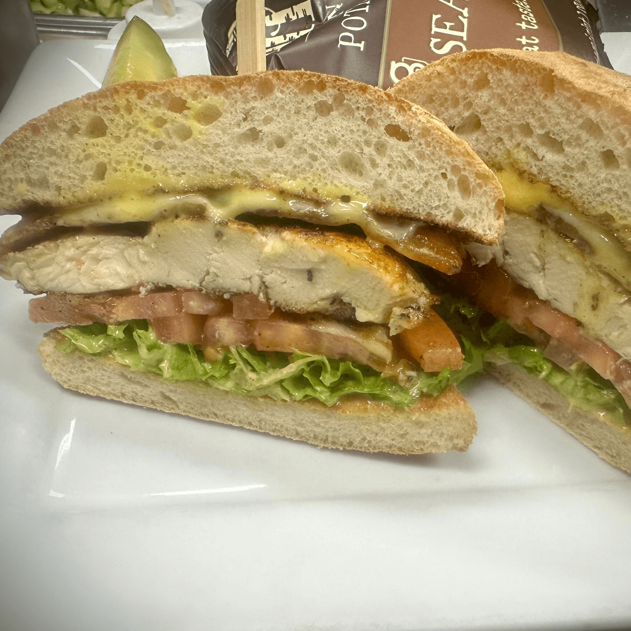 Grilled chicken, bacon, Swiss, honey mustard, lettuce and tomato on a toasted ciabatta bun. Served with kettle chips & a pickle or substitute one of these sides: potato salad, butter beans, small salad; or sub fruit bowl or soup for additional charge