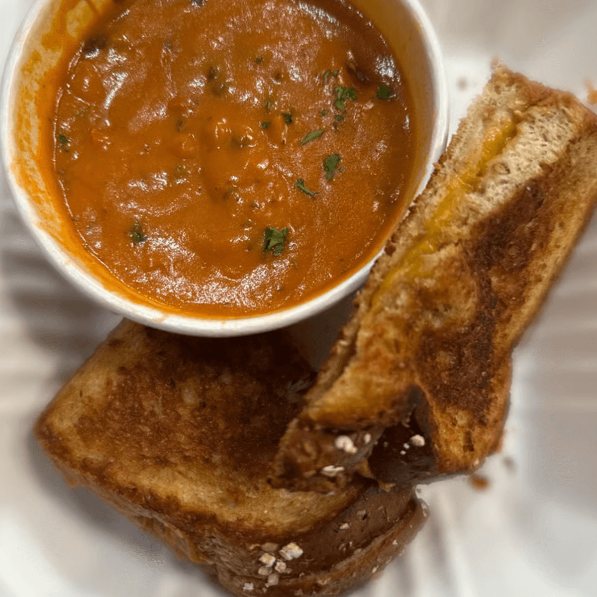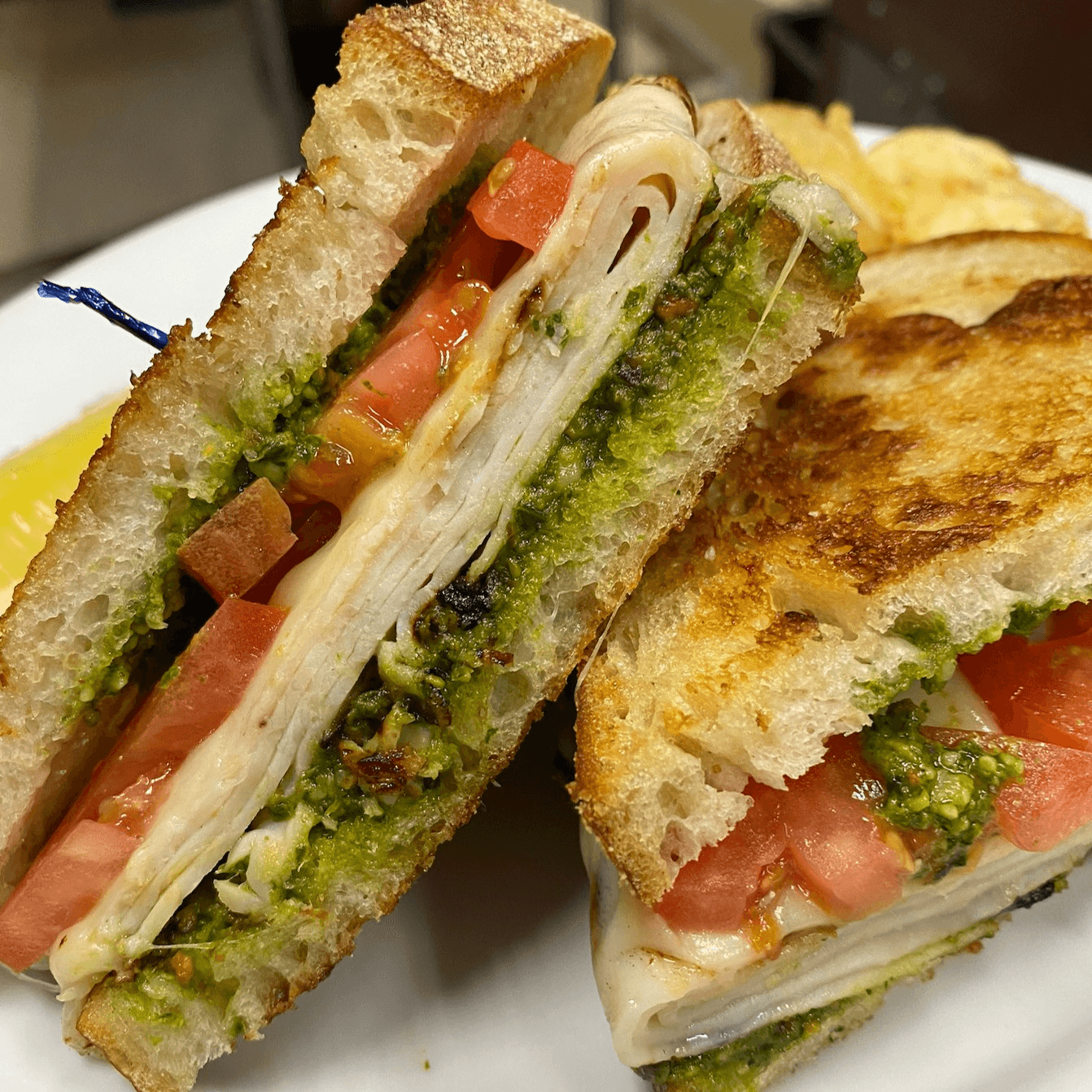 Deli thin sliced turkey, homemade pesto, Swiss, and sliced tomato on grilled wheat bread. Served with kettle chips & a pickle or substitute one of these sides: potato salad, butter beans, small salad; or sub fruit bowl or soup for additional charge