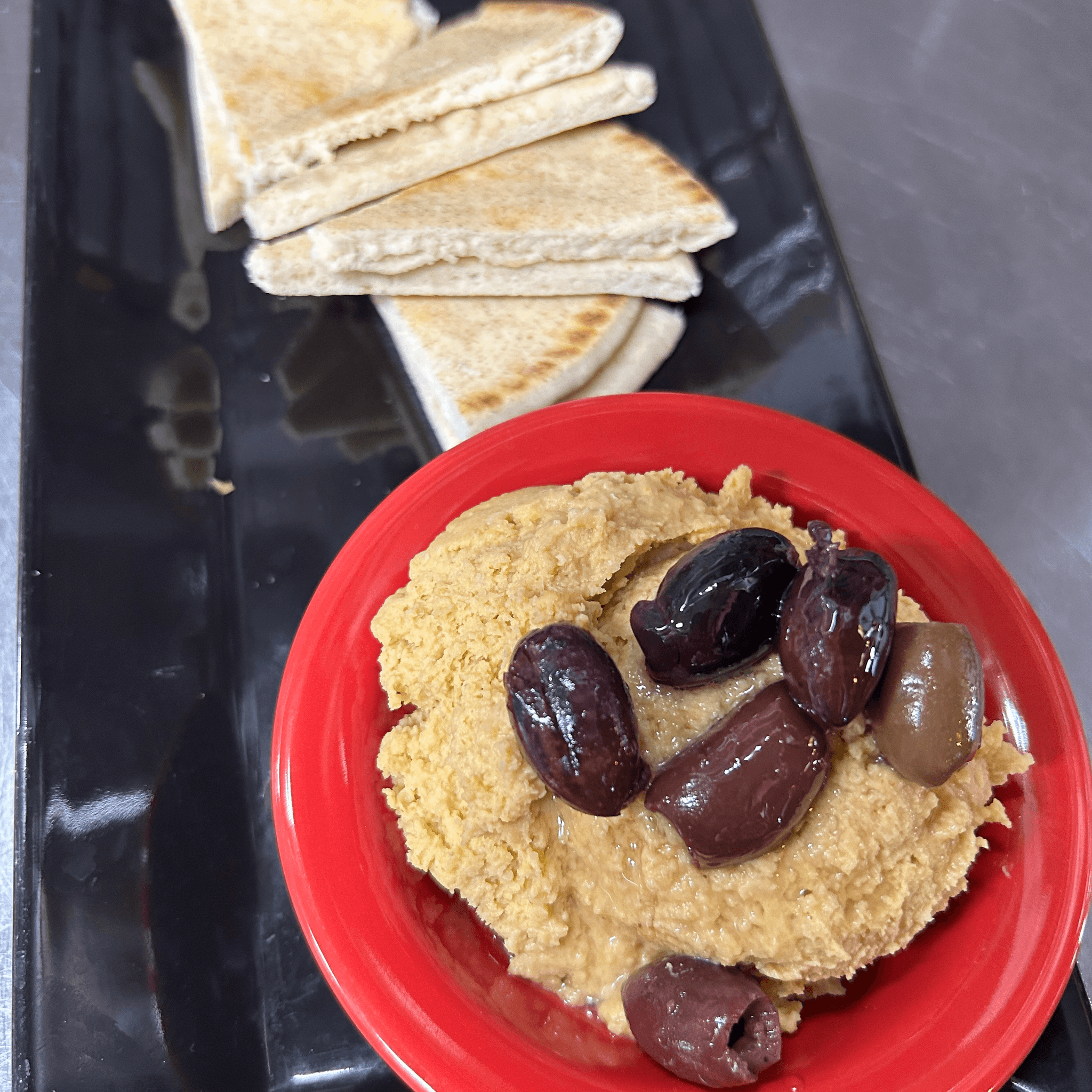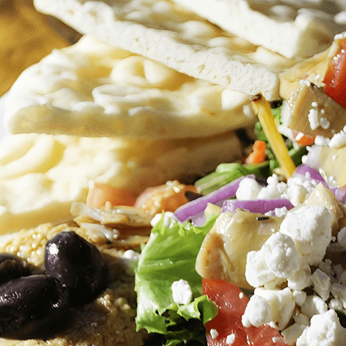 Our house-made hummus served with salad greens, roasted tomatoes, cucumbers, pickled red onions, marinated butter beans, goat cheese crumbles, and kalamata olives with creamy goat cheese dressing on the side. Served with pita bread