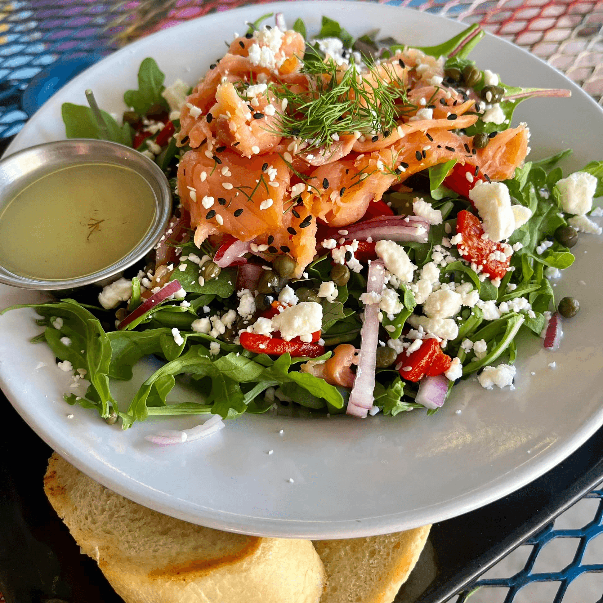 Thin sliced smoked salmon, goat cheese, red onions, capers, roasted red peppers, and fresh dill, served on salad greens and garnished w sesame seeds. Lemon dill dressing. Served with warm bread