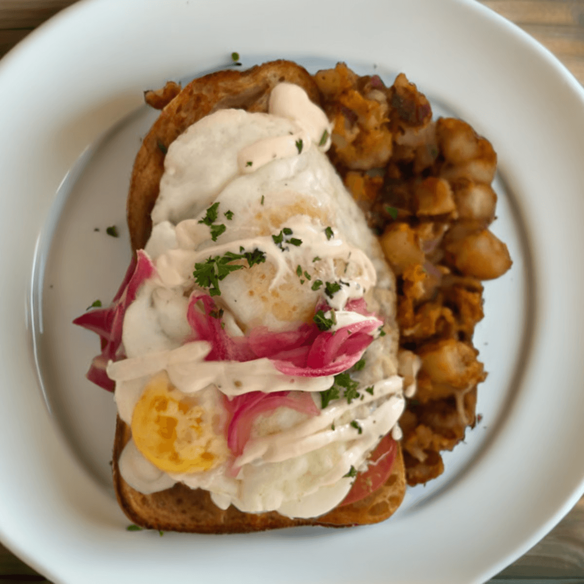 Open faced toasted wheat bread topped with 2 over medium eggs, house-made pesto, avocado, pickled red onion and drizzled with goat cheese dressing, served with home fries