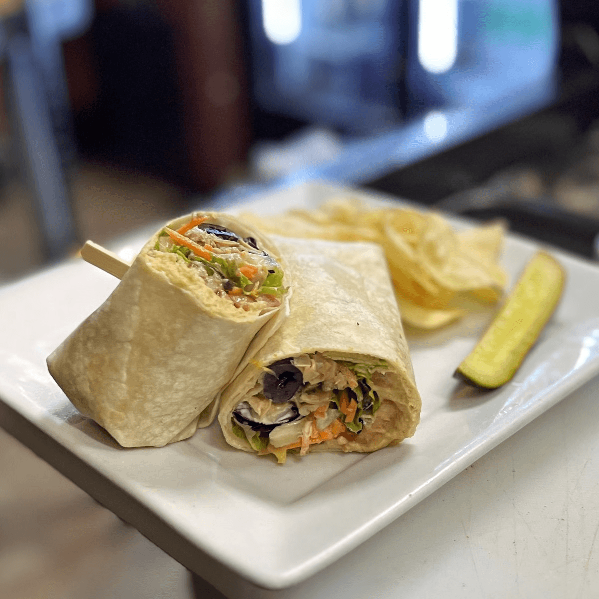 Hummus, salad greens, kalamata olives, roasted tomatoes, cucumber, and butter beans, wrapped in a flour tortilla. Served with kettle chips & a pickle or substitute one of these sides: potato salad, butter beans, small salad; or sub fruit bowl or soup for additional charge