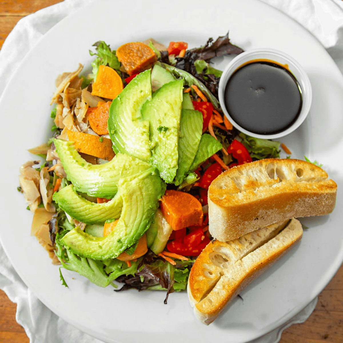 Salad greens topped with sweet potatoes, cucumbers, butter beans, avocado, roasted tomatoes, onions, served with warm bread and balsamic vinaigrette on the side