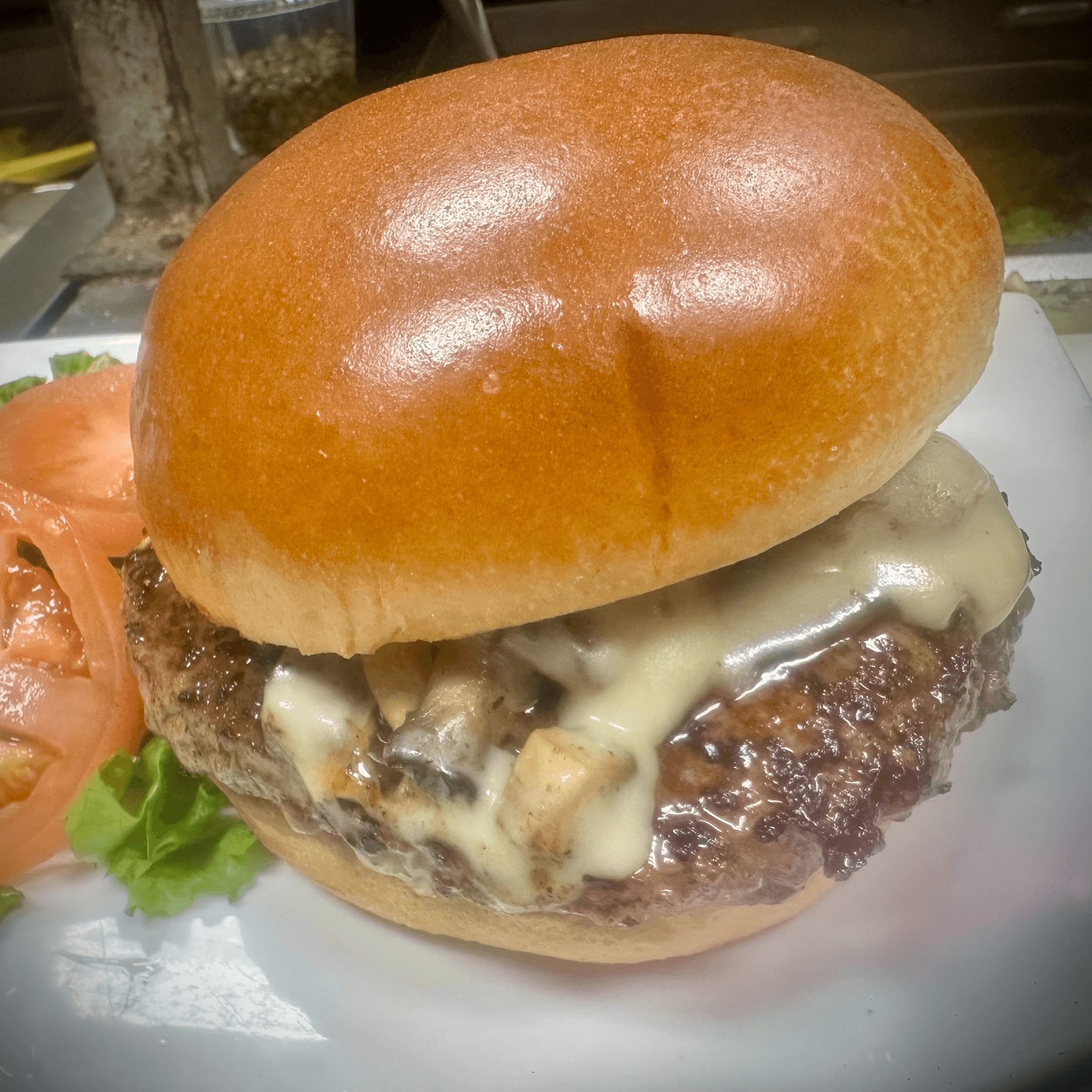 Grilled mushrooms, sliced Swiss, and 1000 island sauce, served with lettuce and tomato on the side. Served with kettle chips & a pickle or substitute one of these sides: potato salad, butter beans, small salad; or sub fruit bowl or soup for additional charge