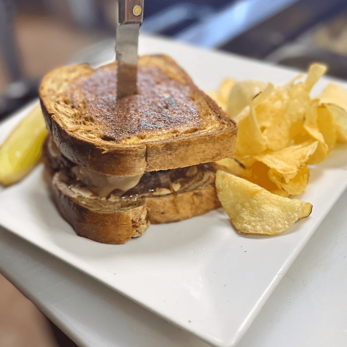 Ground brisket patty topped with swiss, caramelized onions, and 1000 Island on grilled rye. Served with kettle chips & a pickle or substitute one of these sides: potato salad, butter beans, small salad; or sub fruit bowl or soup for additional charge
