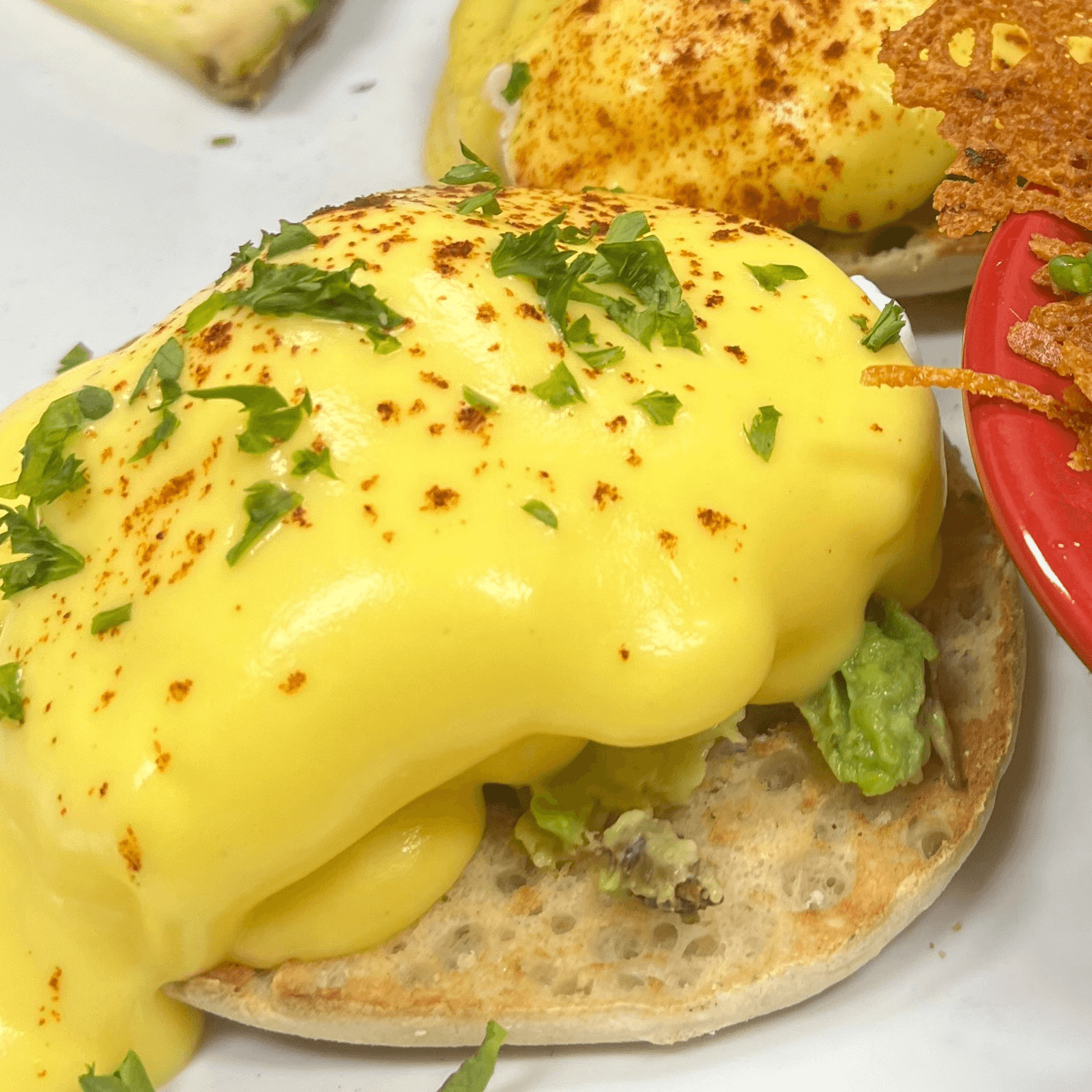Toasted English muffin topped with avocado, poached eggs and hollandaise, served with home fries