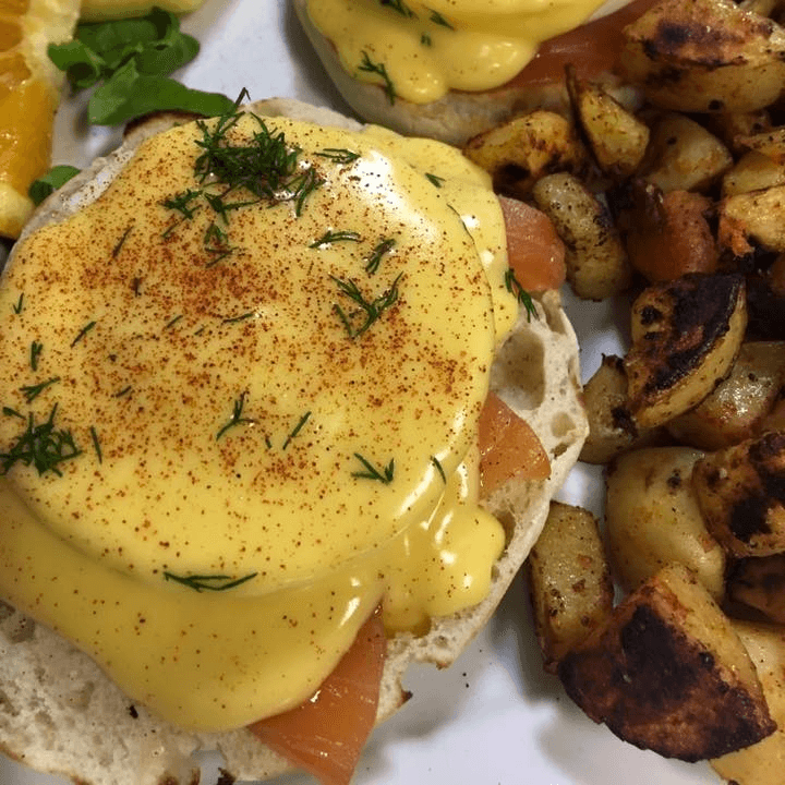 Toasted English muffin topped with sliced tomato, smoked salmon, poached eggs, hollandaise and capers, served with home fries