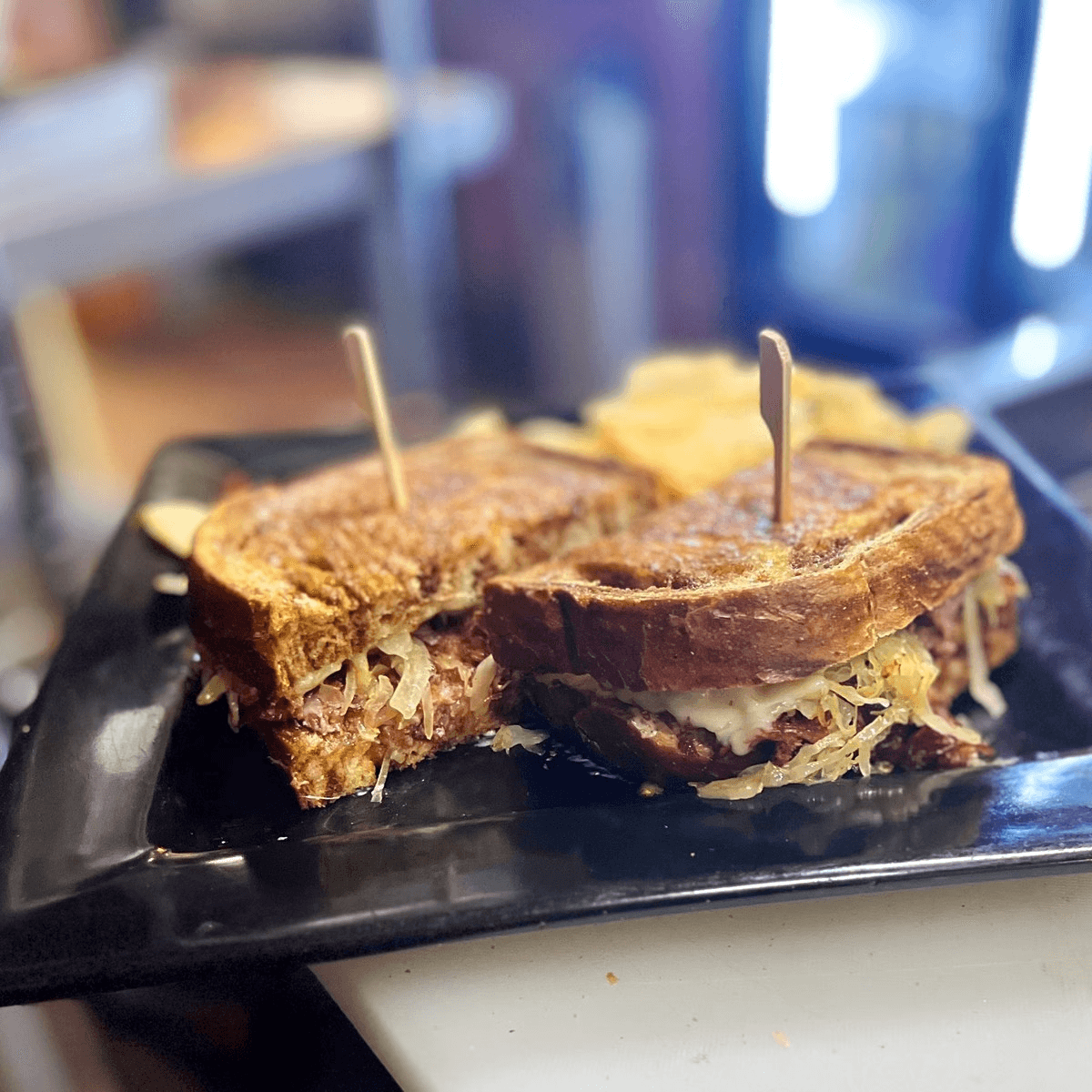 House-cured corned beef, Swiss, sauerkraut, and 1000 island, served on grilled rye. Served with kettle chips & a pickle or substitute one of these sides: potato salad, butter beans, small salad; or sub fruit bowl or soup for additional charge