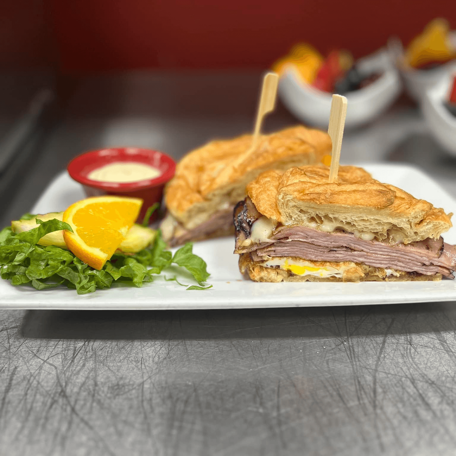 One egg over hard, sliced deli ham, tomato and Swiss with mustard aioli on a warmed croissant