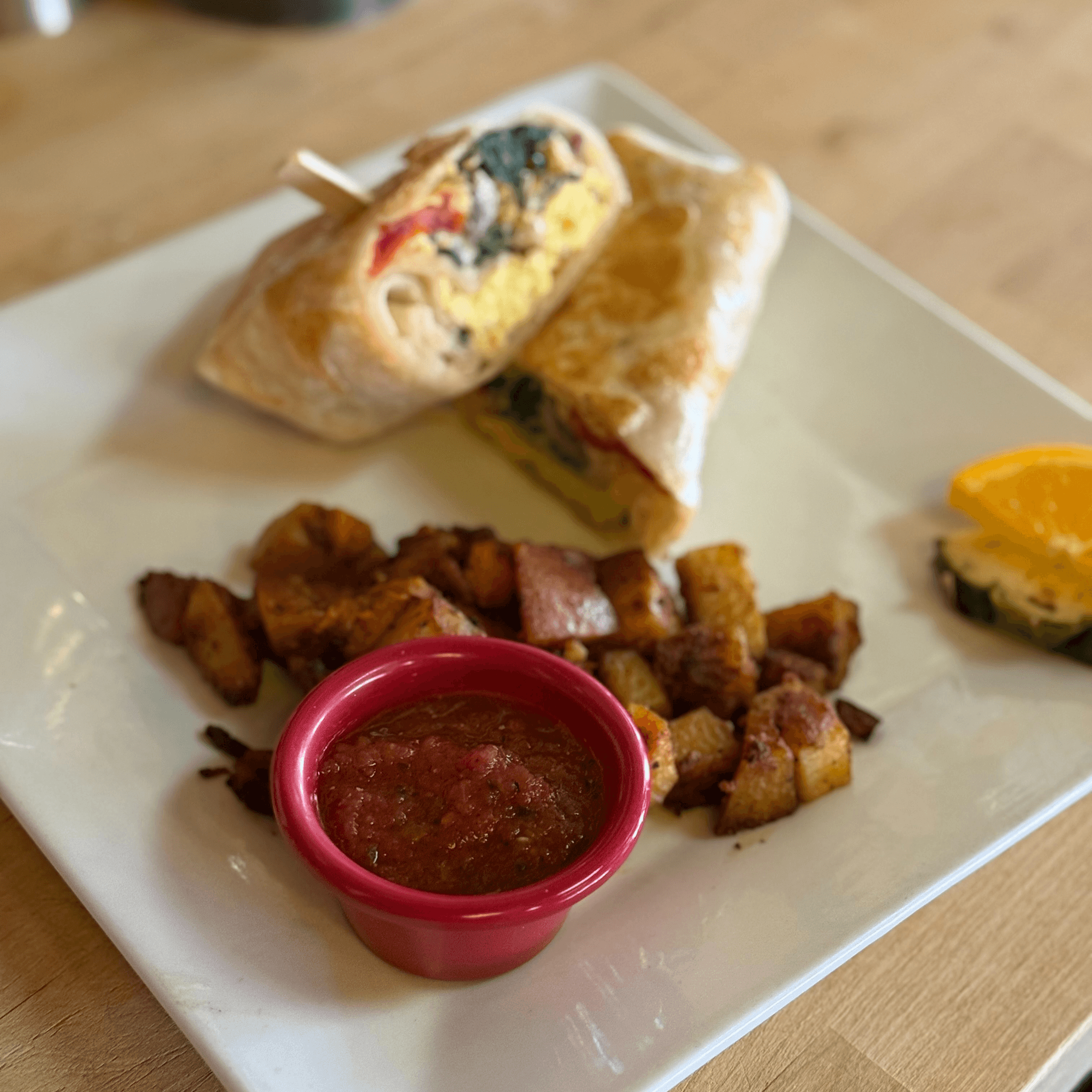 Scrambled eggs, mushrooms, spinach, onion, roasted tomatoes, and swiss cheese wrapped in a flour tortilla. Served with home fries