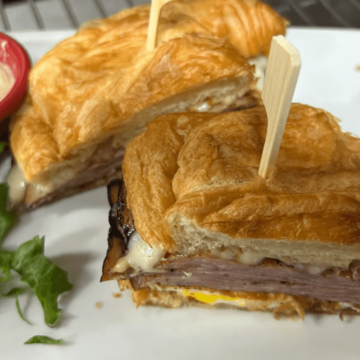Sliced ham and Swiss cheese, with tomato and mustard aioli, on a toasted croissant. Served with kettle chips & a pickle or substitute one of these sides: potato salad, butter beans, small salad; or sub fruit bowl or soup for additional charge